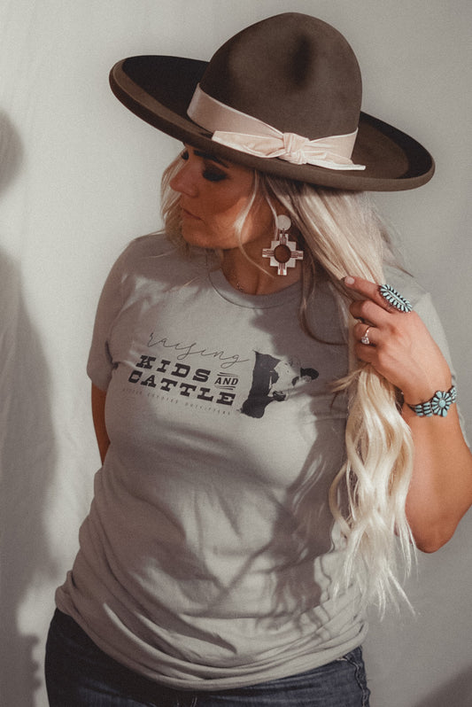 “Raising Kids and Cattle” Adult Unisex Western Graphic Tee in Stone