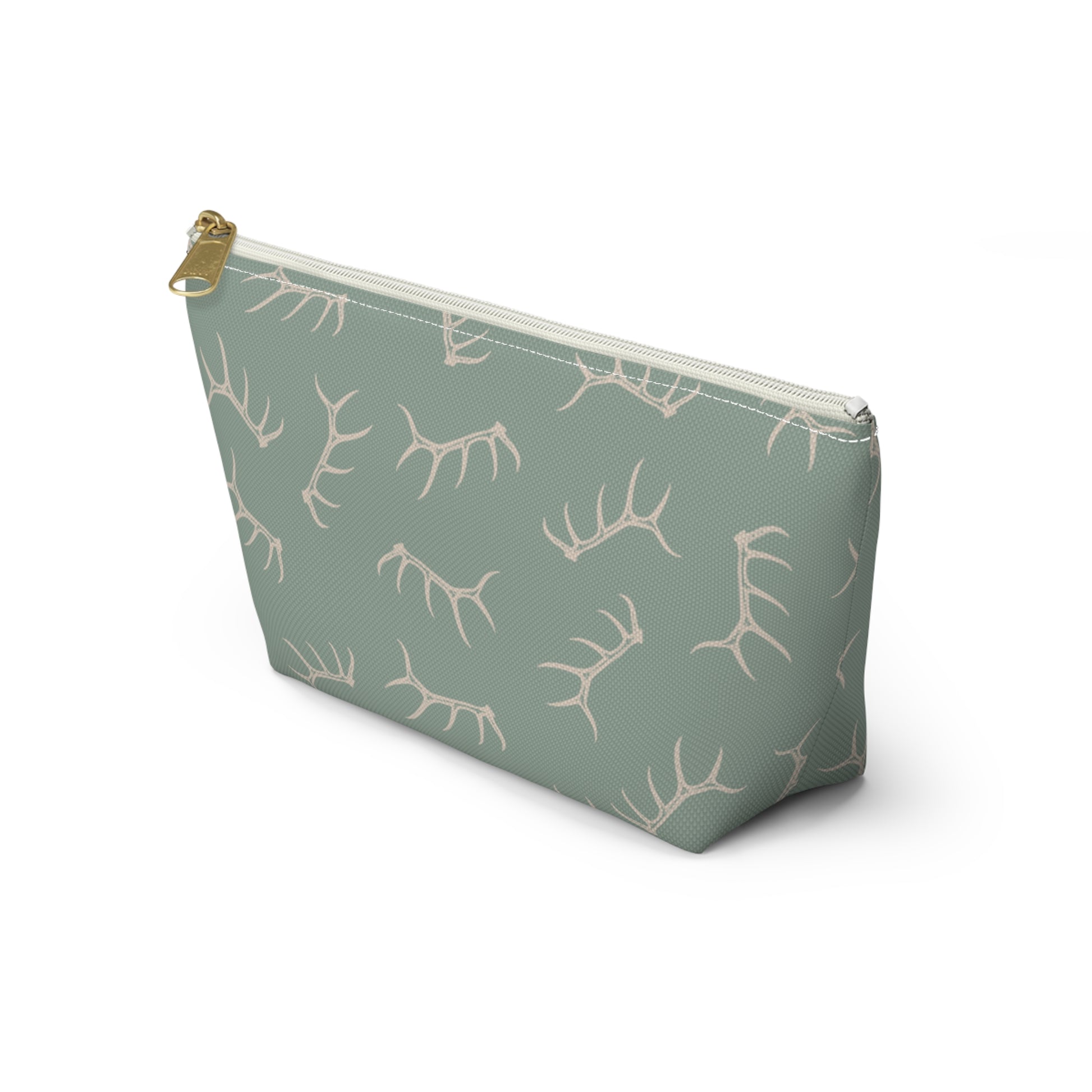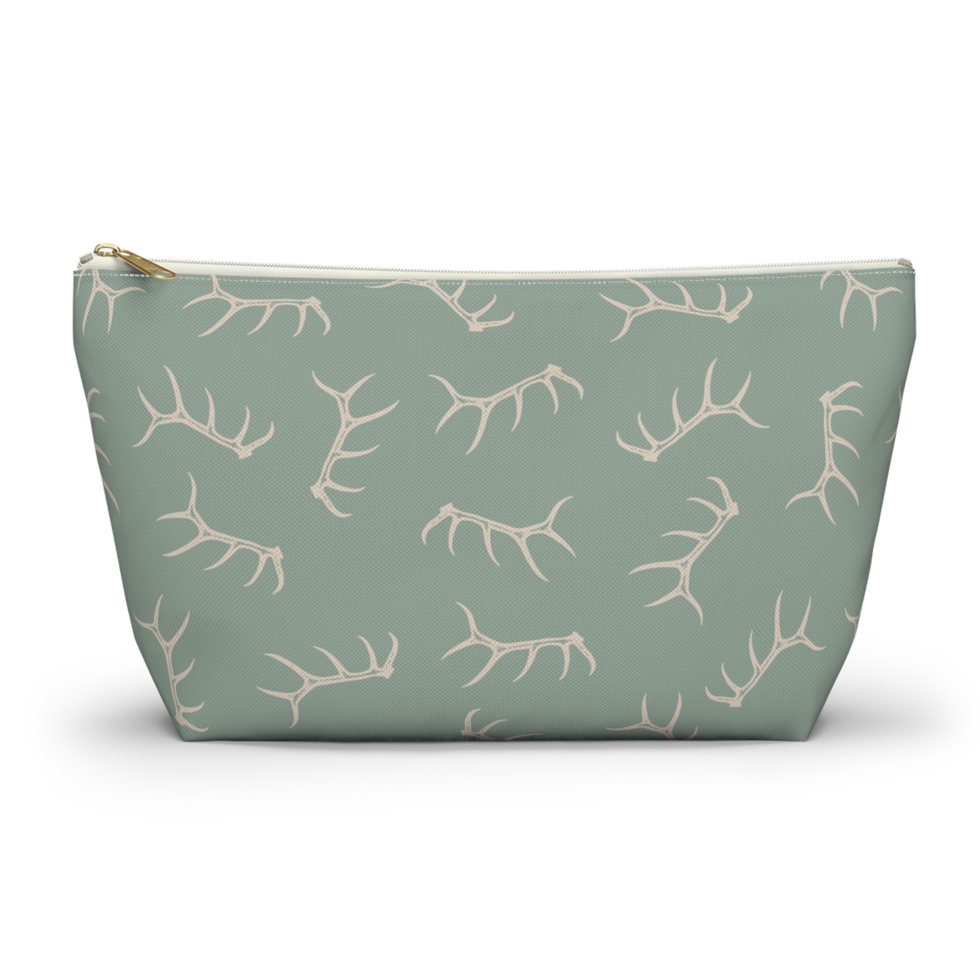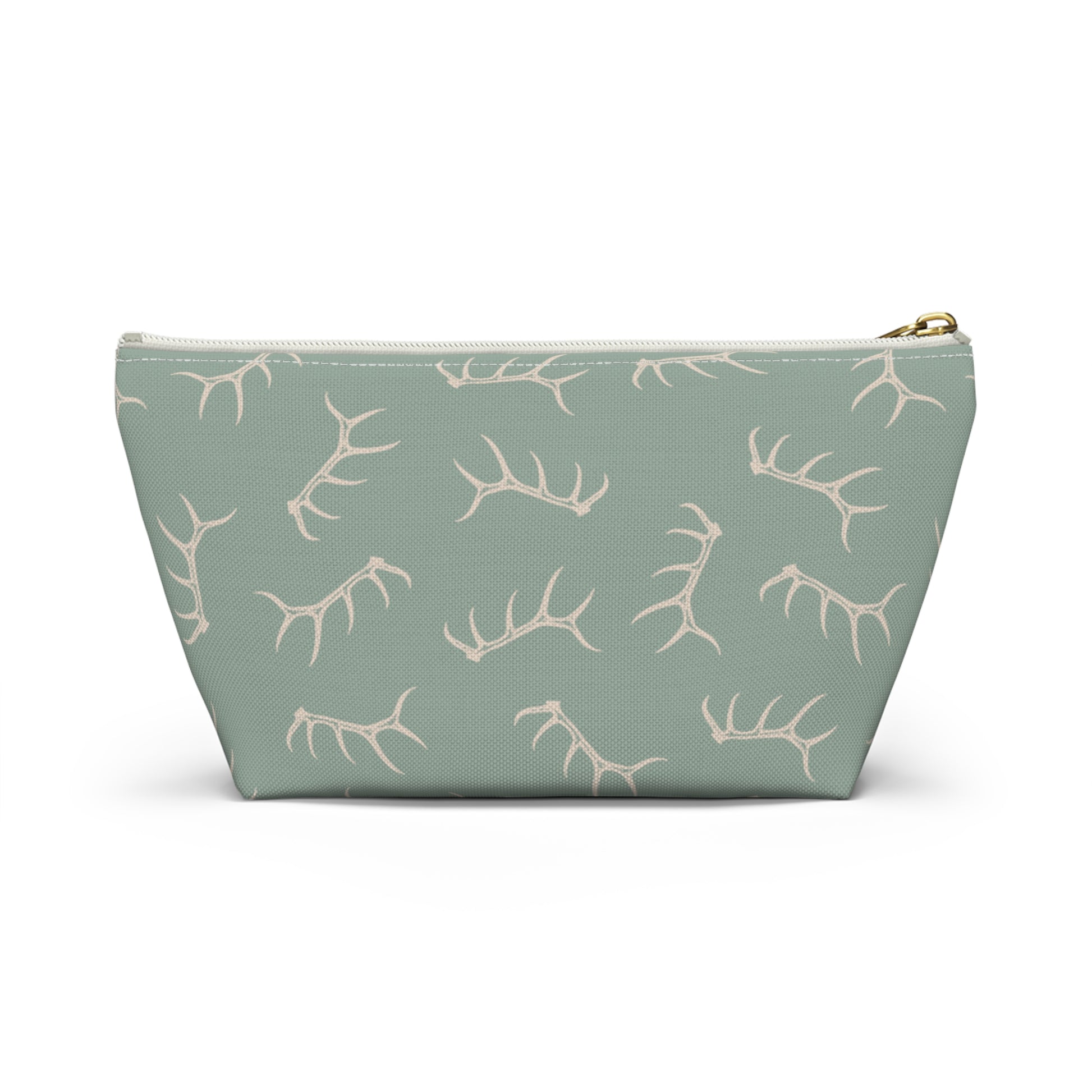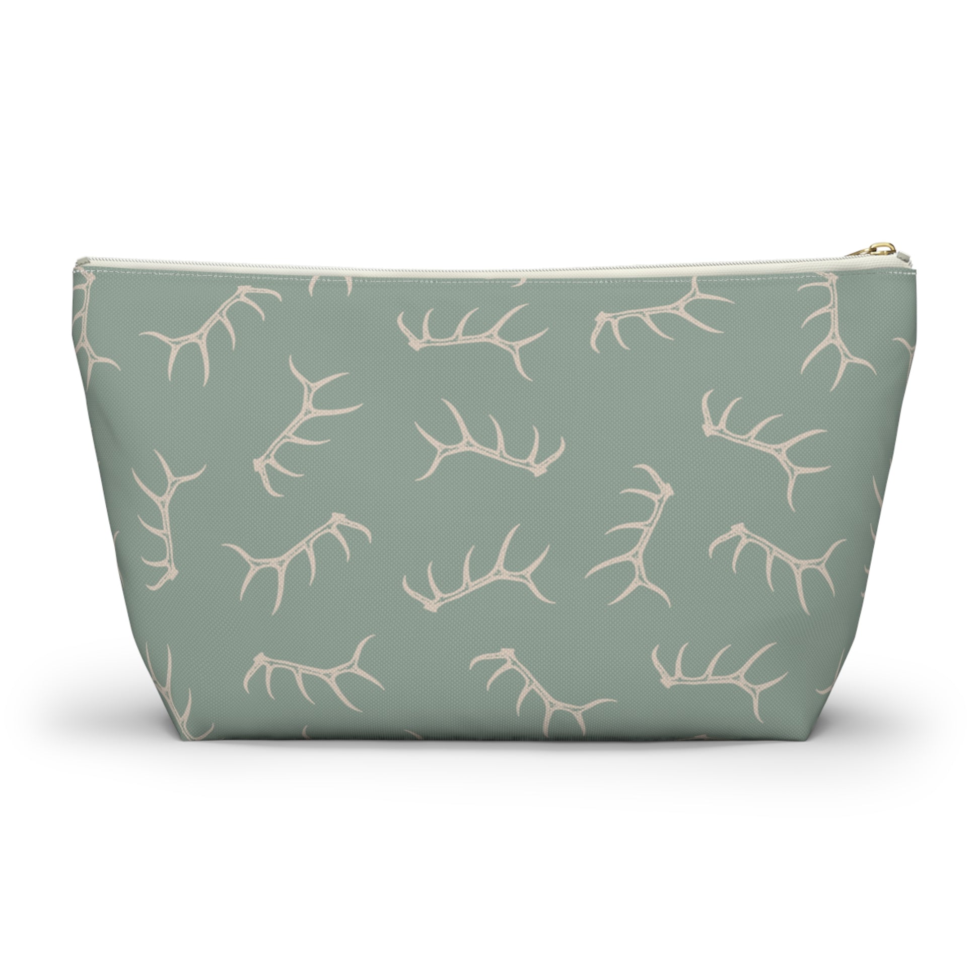 Our t-bottom pouches can be used for pretty much anything. They make excellent pencil cases and makeup bags. They are constructed from durable material with a zipper enclosure. Features our original Little Coyotes elk shed print in denim.